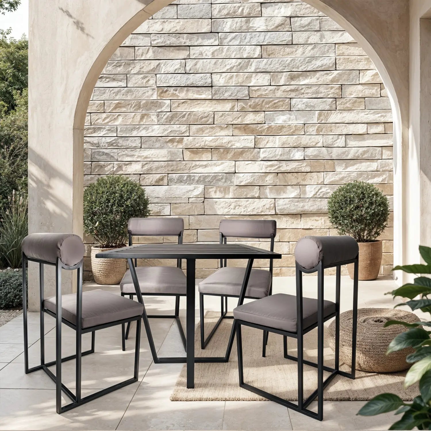 يجمع طقم فيترا بين التصميم العصري والراحة اليومية، مع هيكل مصنوع من الألمنيوم خفيف الوزن لسهولة الحركة ومتانة تدوم. تأتي الكراسي مزوّدة بوسائد مبطنة بإسفنج عالي الكثافة لدعم مريح يدوم طويلاً، وتتوفر بلمسين أنيقين: قماش خارجي بتأثير الكتان للجلوس في الهواء الطلق، أو لمسة جلدية سوداء فاخرة للاستخدام الداخلي الأنيق.