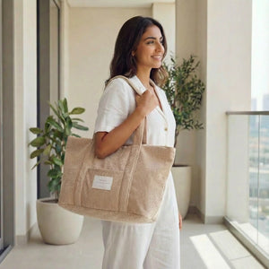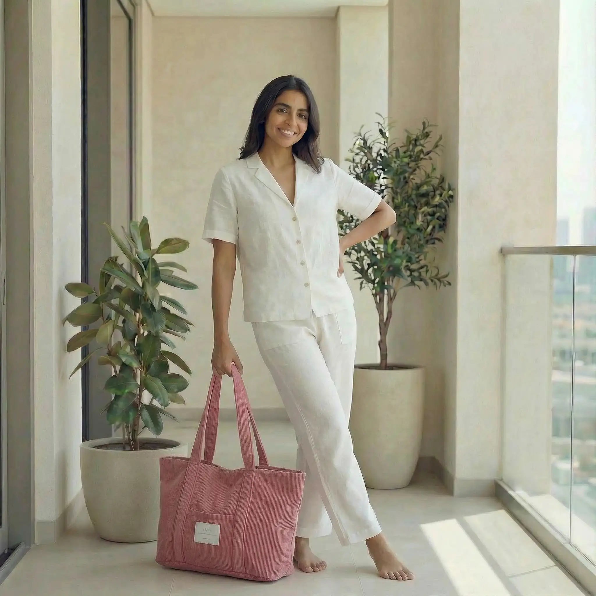 قدّمي لنفسك الرفيق المثالي لأيام الشمس على الشاطئ أو جولات التسوق الخفيفة. مصنوعة من قماش الكوردروي الناعم والمتين، وتتميّز بمساحة واسعة تسع كل احتياجاتك، من مناشف الشاطئ وكريمات الشمس، إلى أغراضك اليومية المتنوعة.