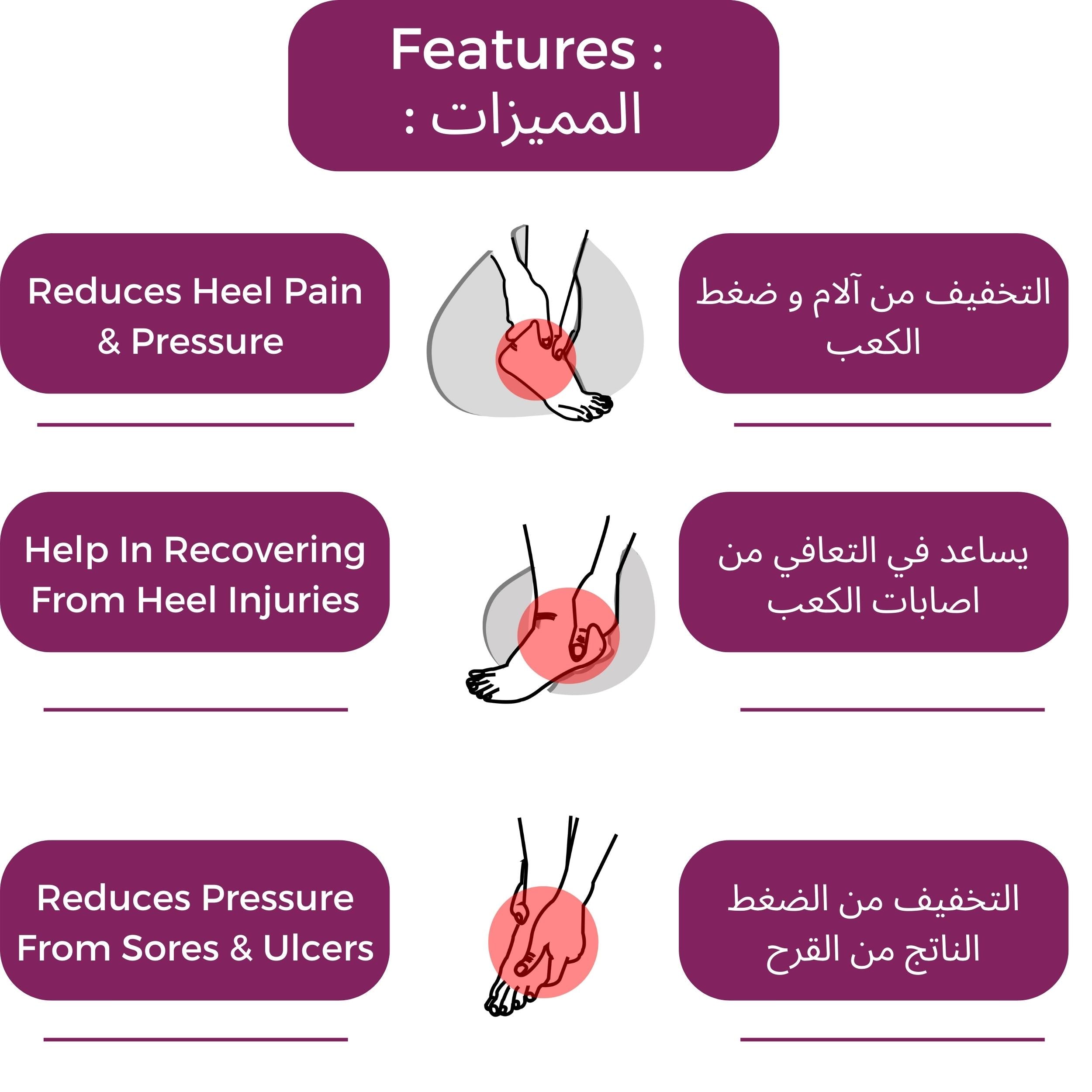 وسادة تخفيف آلام الكعب هي الخيار الأمثل لتقليل ضغط الكعب. توفر وسادة الكعب هذه الراحة وتوفر أقصى حماية إضافية للكاحل وكعب القدم. مصممة بجودة عالية بقماش صديق للبشرة ،و فيبر عالي الجودة لتوفير راحة من الضغط مع شريطين مرنين قابلين للتعديل لكل وسادة لضبط المقاس المناسب. تساعد الوسادة الواقية للكعب الخاصة بنا في تخفيف آلام الكعب وتقليل الضغط الناتج عن التقرحات وتساعد أيضًا في التعافي من إصابات الكعب ، فهي تحافظ على الكعب بعيدًا عن السطح أو المرتبة
