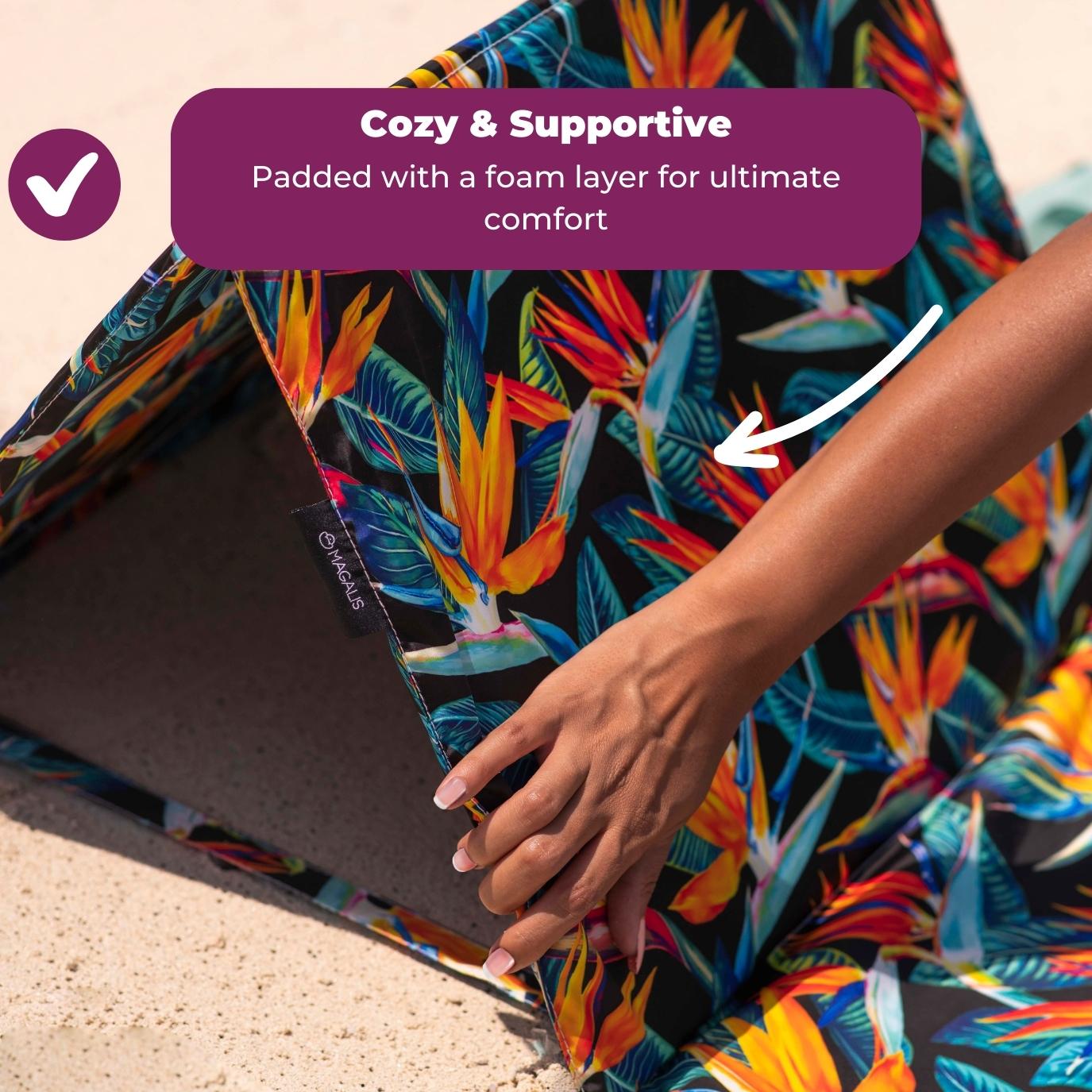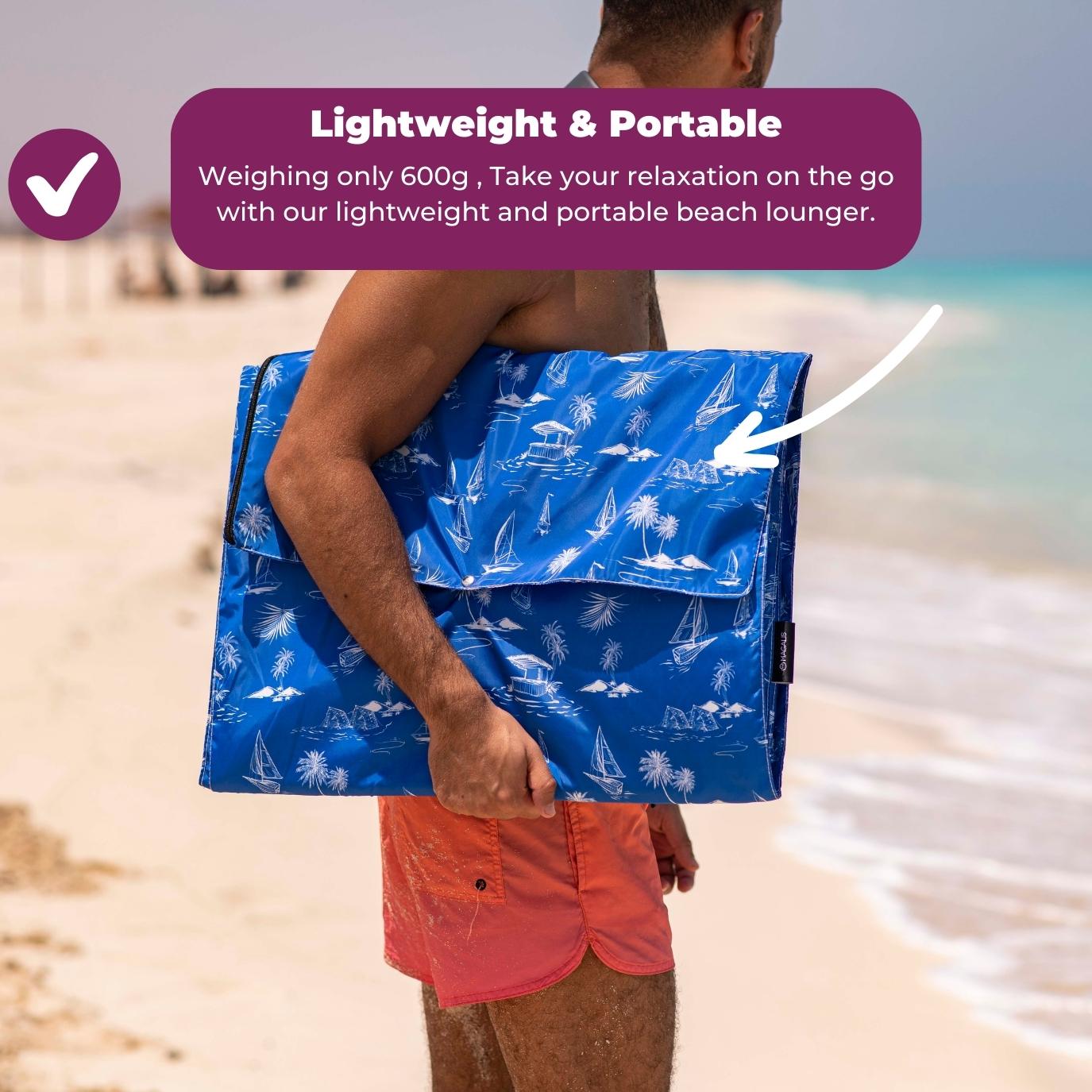 يتميز بمسند ظهر قابل للتعديل وجيب بسحاب قابل للفصل لحفظ الأشياء الصغيرة بعيدًا عن الرمال