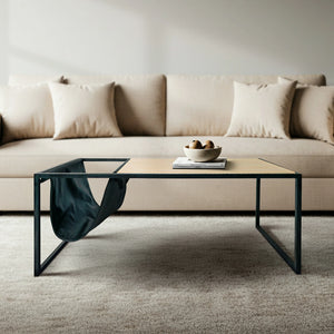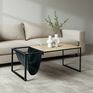 The Cira Coffee Table blends simple style with smart function. It features a light wood-look top, a sleek black metal frame, and a built-in faux leather sling for storing magazines, books, or remote controls. Its clean design fits easily into any modern living space while keeping your essentials within reach.