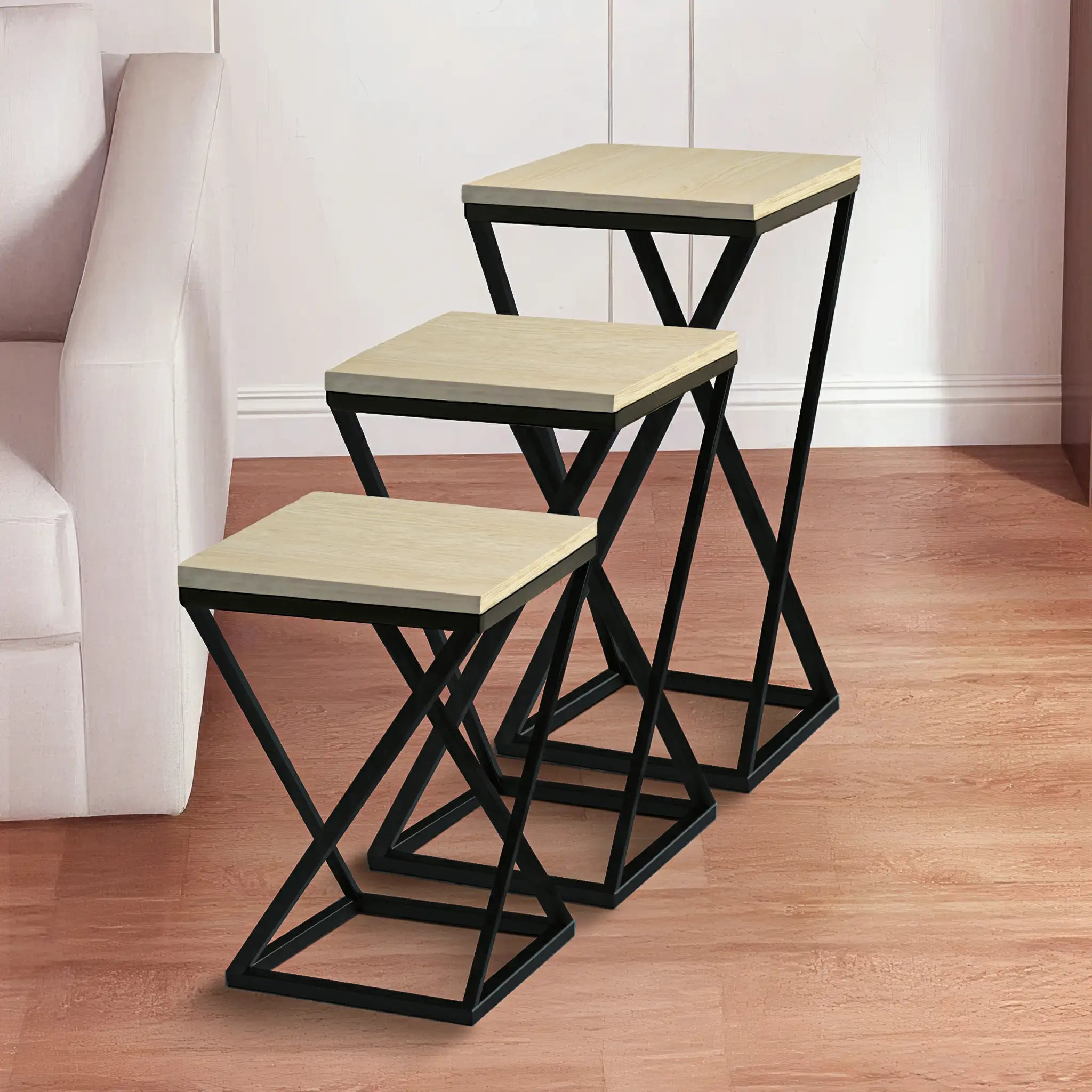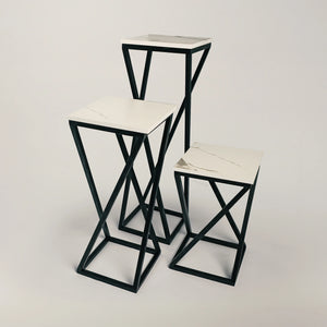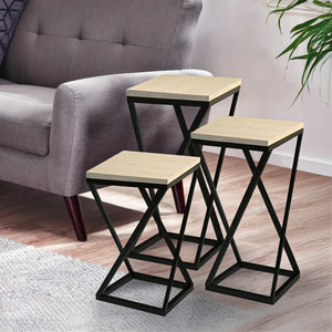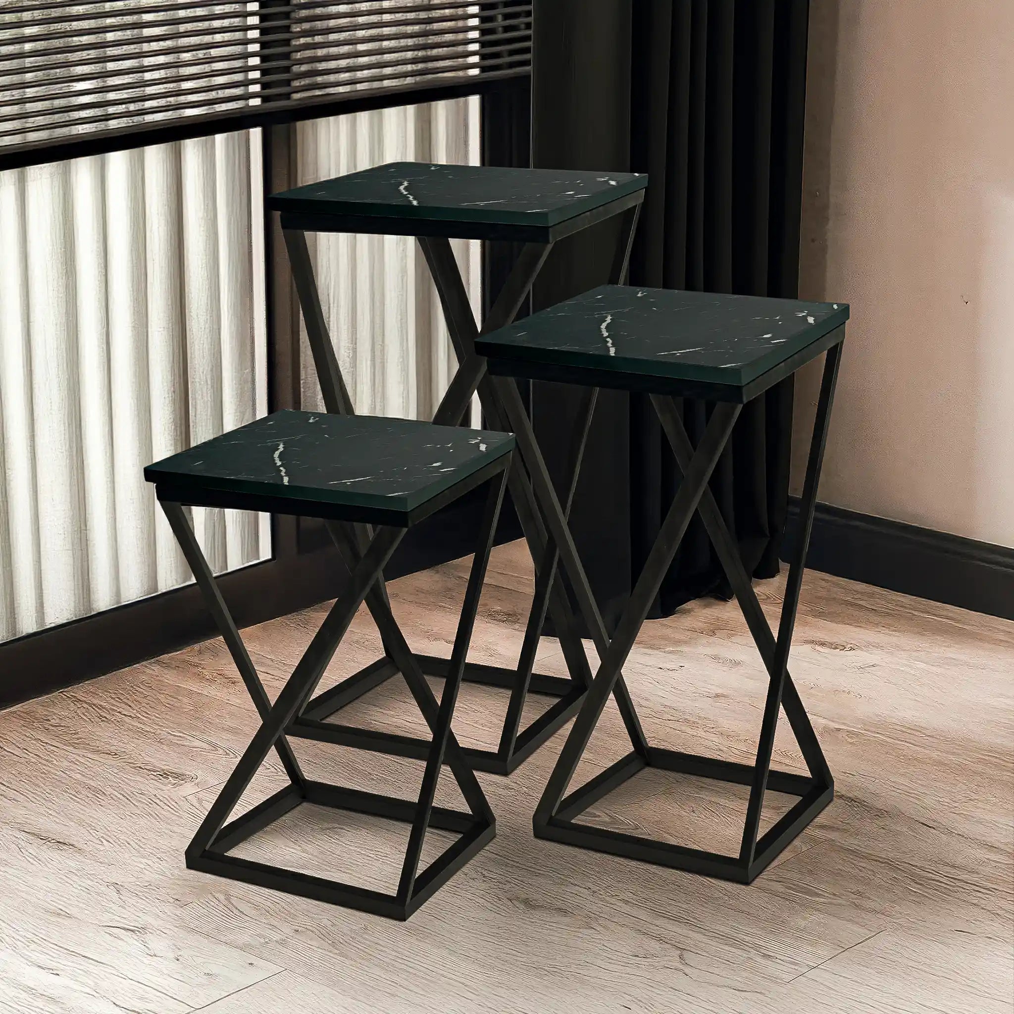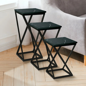 The Ostra Side Table Set includes three nesting tables with bold black metal frames and a stylish X-leg design. Choose from white marble, black marble, or natural wood tabletops to match your space. Use them together or apart — perfect for the living room, bedroom, or anywhere you need extra surface space. Strong, lightweight, and easy to move.