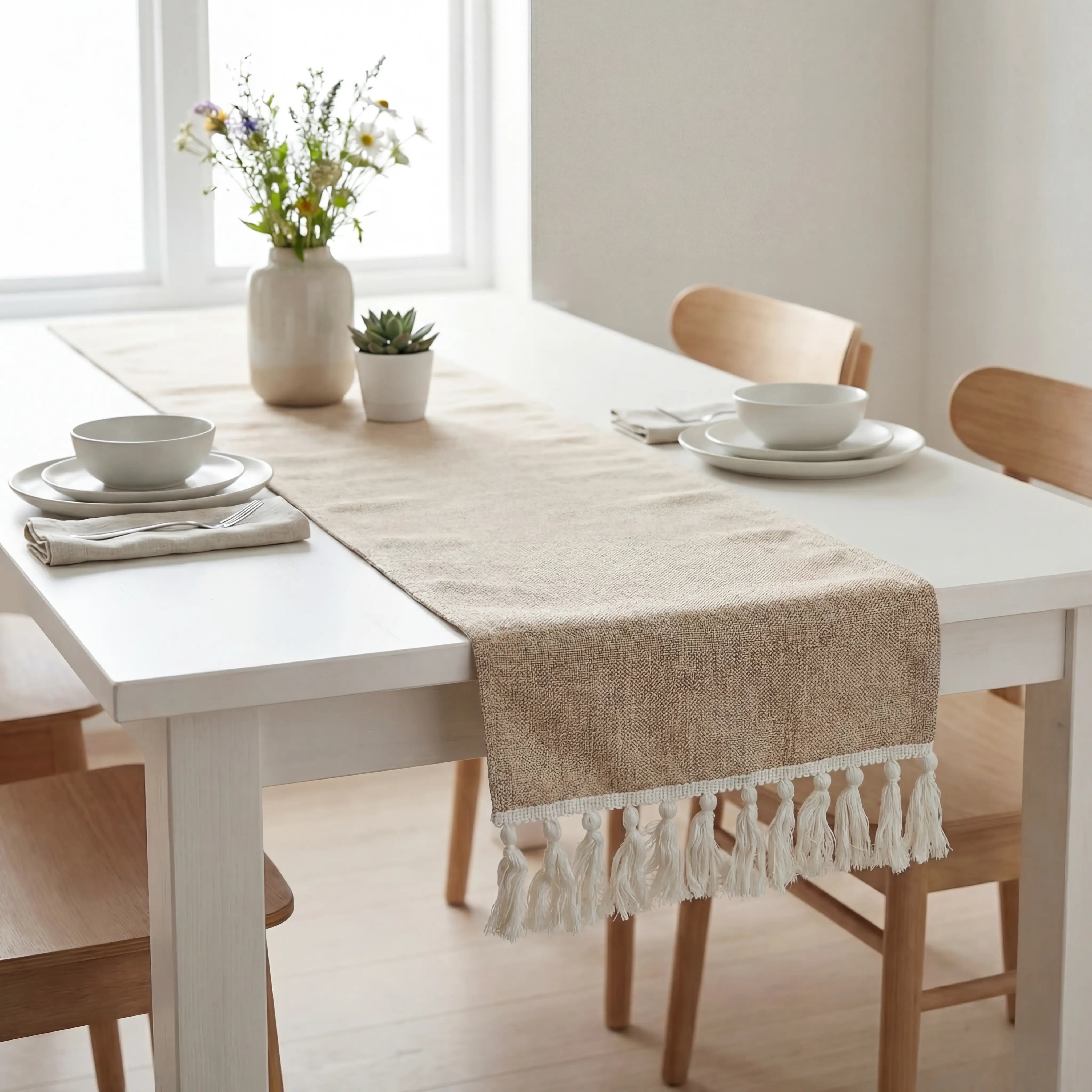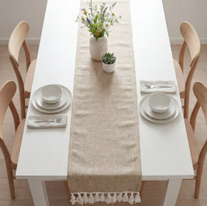 The Alva Table Runner features a soft, Jute-Inspired Woven Fabric that brings a naturally refined feel to your dining space. Designed with delicate fringe tassels, it adds movement and warmth — perfect for both everyday meals and special occasions.